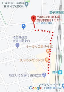 JR宇都宮線白岡駅西口を出て、駅前通りを右にを久喜方面に向かって頂くと160mで柳石材店さんの前に到着しますので、そのT字路を左折していただくと14階建てのマンション「サンロードステーションさん」が右側に見えますので、その1軒先の6階建てのビル『イリーデ・カーサ1階』が当医院になります。